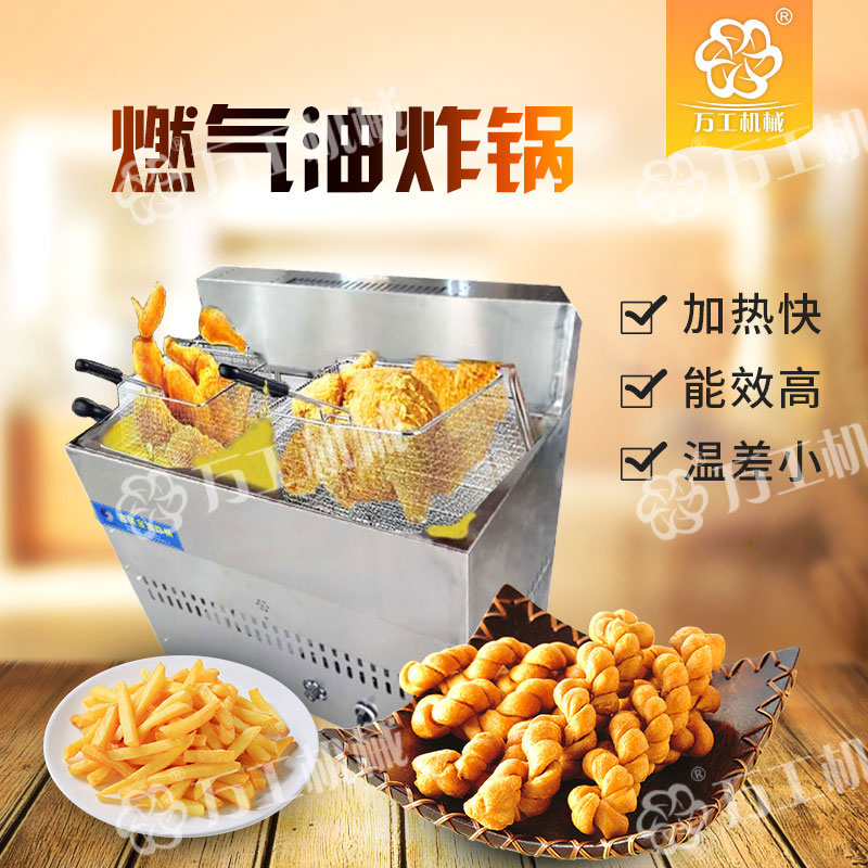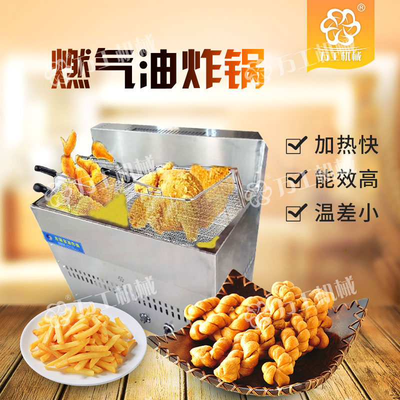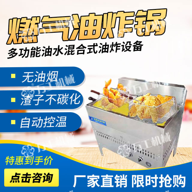 寶雞萬工機械生産的燃氣油炸鍋是一種無煙型、多功能、油水混合式油炸設備,該設備採(cǎi)取從油層中部加熱的方式,控制上下油層的溫度,有效緩解炸油的氧化程度,抑制酸介質升高,在油炸過程中自動過濾殘查、自動控溫,從而延長瞭(le)機器的使用壽命。鍋體材質爲全不鏽鋼,能效比高、清潔環保無污染,便於(yú)清渣,使用成本低,操作簡單(dān)、安全。